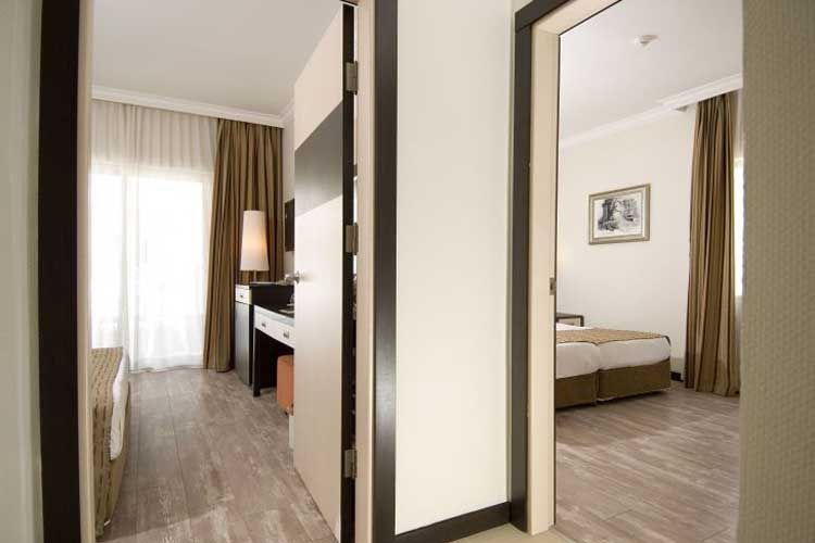34 Family oda 45 m² 2 ayrı yatak odası, Laminant zemin, Banyo-WC, direkt hatlı telefon, merkezi klima sistemi, saç kurutma makinesi, LCD TV, uydu yayını, mini bar, kasa, balkon.